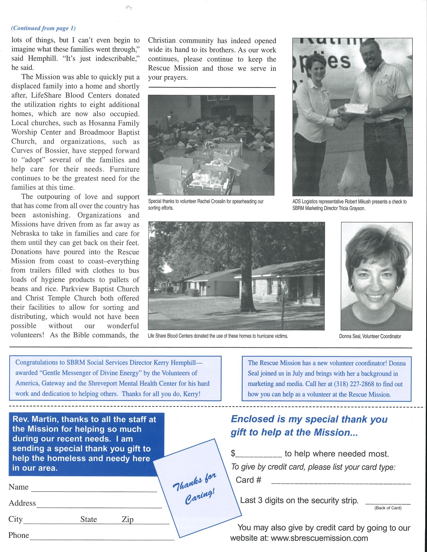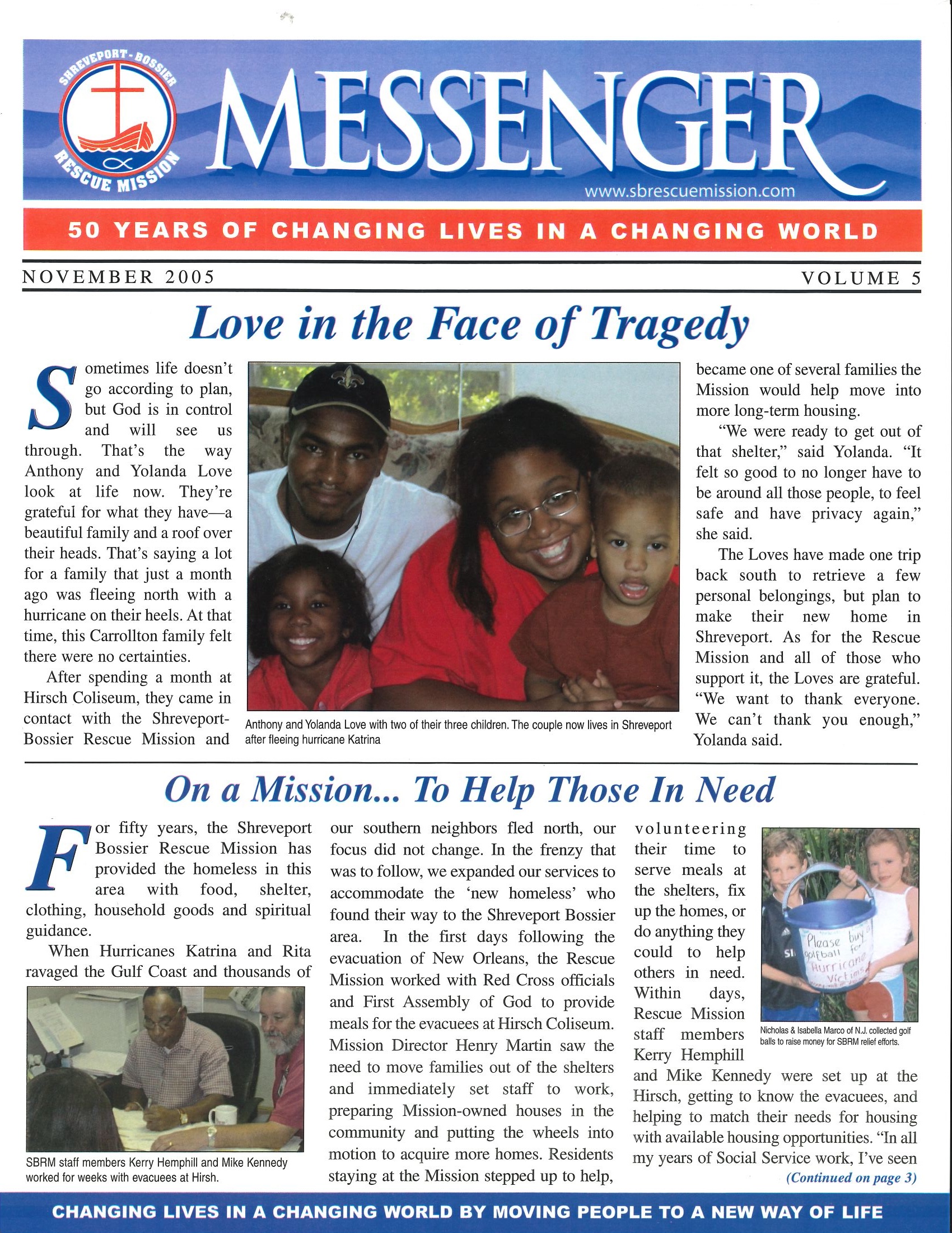 In August 2005, Hurricane Katrina devastated the Gulf Coast and displaced hundreds of thousands of people. Shreveport-Bossier quickly became a refuge for evacuees, and the Shreveport-Bossier Rescue Mission stood ready to respond.
